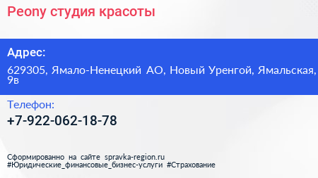 Peony, студия красоты по адресу 629305, Ямало-Ненецкий АО, Новый Уренгой, Ямальская, 9в в дальнейшем Организация, размещена в следующих категориях: