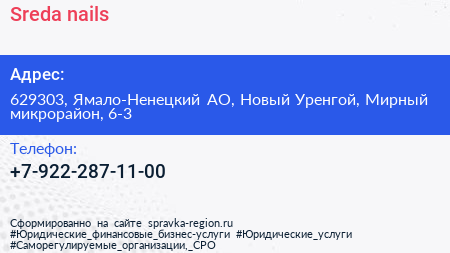 Sreda nails по адресу 629303, Ямало-Ненецкий АО, Новый Уренгой, Мирный микрорайон, 6-3 в дальнейшем Организация, размещена в следующих категориях: