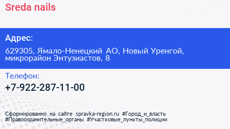 Sreda nails по адресу 629305, Ямало-Ненецкий АО, Новый Уренгой, микрорайон Энтузиастов, 8 в дальнейшем Организация, размещена в следующих категориях: