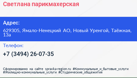Светлана, парикмахерская по адресу 629305, Ямало-Ненецкий АО, Новый Уренгой, Таёжная, 13а в дальнейшем Организация, размещена в следующих категориях: