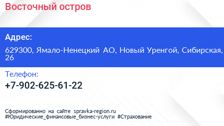 Восточный остров по адресу 629300, Ямало-Ненецкий АО, Новый Уренгой, Сибирская, 26 в дальнейшем Организация, размещена в следующих категориях: