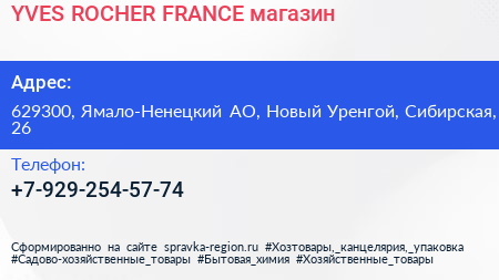 YVES ROCHER FRANCE, магазин по адресу 629300, Ямало-Ненецкий АО, Новый Уренгой, Сибирская, 26 в дальнейшем Организация, размещена в следующих категориях: