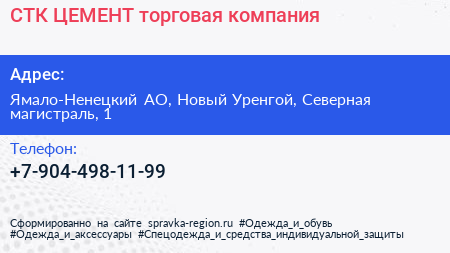 СТК ЦЕМЕНТ, торговая компания по адресу Ямало-Ненецкий АО, Новый Уренгой, Северная магистраль, 1 в дальнейшем Организация, размещена в следующих категориях: