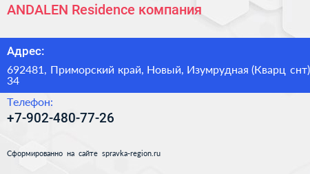 ANDALEN Residence, компания по адресу 692481, Приморский край, Новый, Изумрудная (Кварц снт), 34 в дальнейшем Организация, размещена в следующих категориях: