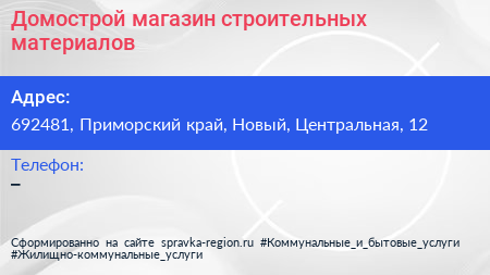 Домострой, магазин строительных материалов по адресу 692481, Приморский край, Новый, Центральная, 12 в дальнейшем Организация, размещена в следующих категориях: