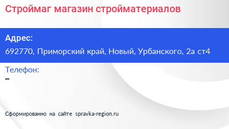 Строймаг, магазин стройматериалов по адресу 692770, Приморский край, Новый, Урбанского, 2а ст4 в дальнейшем Организация, размещена в следующих категориях: