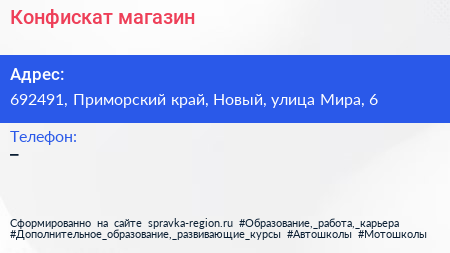 Конфискат, магазин по адресу 692491, Приморский край, Новый, улица Мира, 6 в дальнейшем Организация, размещена в следующих категориях: