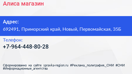 Алиса, магазин по адресу 692491, Приморский край, Новый, Первомайская, 35Б в дальнейшем Организация, размещена в следующих категориях: