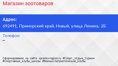 Магазин зоотоваров по адресу 692491, Приморский край, Новый, улица Ленина, 2Б в дальнейшем Организация, размещена в следующих категориях: