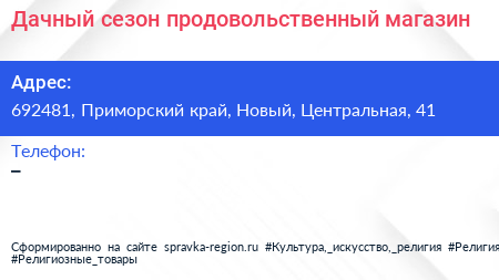 Дачный сезон, продовольственный магазин по адресу 692481, Приморский край, Новый, Центральная, 41 в дальнейшем Организация, размещена в следующих категориях: