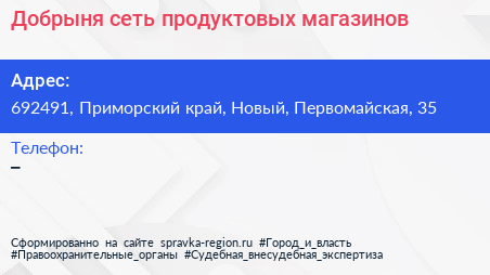 Добрыня, сеть продуктовых магазинов по адресу 692491, Приморский край, Новый, Первомайская, 35 в дальнейшем Организация, размещена в следующих категориях: