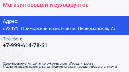 Магазин овощей и сухофруктов по адресу 692491, Приморский край, Новый, Первомайская, 7а в дальнейшем Организация, размещена в следующих категориях: