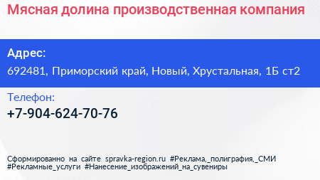 Мясная долина, производственная компания по адресу 692481, Приморский край, Новый, Хрустальная, 1Б ст2 в дальнейшем Организация, размещена в следующих категориях: