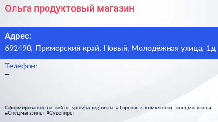 Ольга, продуктовый магазин по адресу 692490, Приморский край, Новый, Молодёжная улица, 1д в дальнейшем Организация, размещена в следующих категориях: