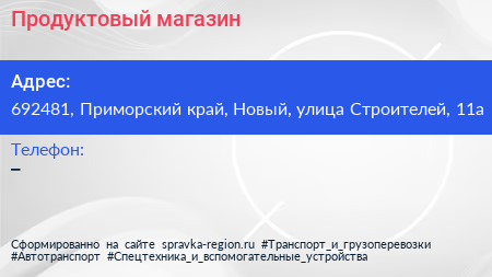 Продуктовый магазин по адресу 692481, Приморский край, Новый, улица Строителей, 11а в дальнейшем Организация, размещена в следующих категориях: