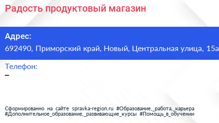 Радость, продуктовый магазин по адресу 692490, Приморский край, Новый, Центральная улица, 15а в дальнейшем Организация, размещена в следующих категориях: