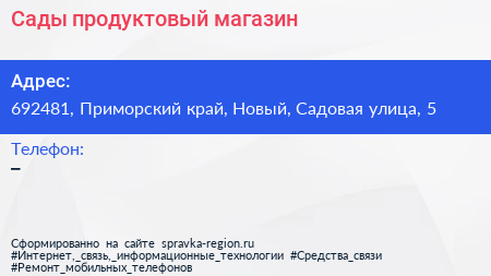 Сады, продуктовый магазин по адресу 692481, Приморский край, Новый, Садовая улица, 5 в дальнейшем Организация, размещена в следующих категориях: