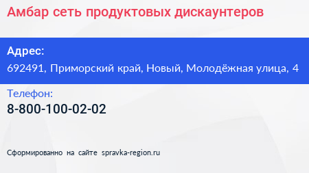 Амбар, сеть продуктовых дискаунтеров по адресу 692491, Приморский край, Новый, Молодёжная улица, 4 в дальнейшем Организация, размещена в следующих категориях:
