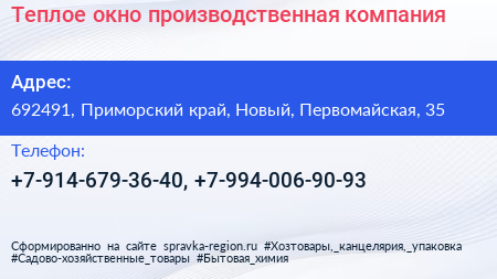 Теплое окно, производственная компания по адресу 692491, Приморский край, Новый, Первомайская, 35 в дальнейшем Организация, размещена в следующих категориях: