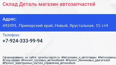 Склад-Деталь, магазин автозапчастей по адресу 692491, Приморский край, Новый, Хрустальная, 15 ст4 в дальнейшем Организация, размещена в следующих категориях: