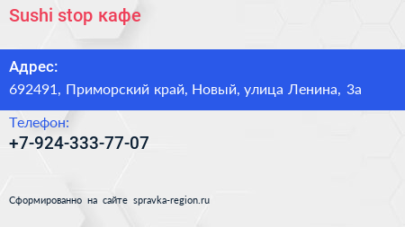 Sushi stop, кафе по адресу 692491, Приморский край, Новый, улица Ленина, 3а в дальнейшем Организация, размещена в следующих категориях: