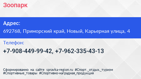 Зоопарк по адресу 692768, Приморский край, Новый, Карьерная улица, 4 в дальнейшем Организация, размещена в следующих категориях: