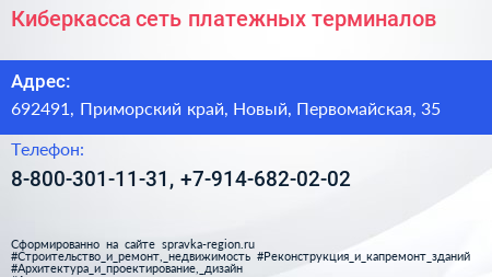 Киберкасса, сеть платежных терминалов по адресу 692491, Приморский край, Новый, Первомайская, 35 в дальнейшем Организация, размещена в следующих категориях: