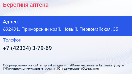 Берегиня, аптека по адресу 692491, Приморский край, Новый, Первомайская, 35 в дальнейшем Организация, размещена в следующих категориях: