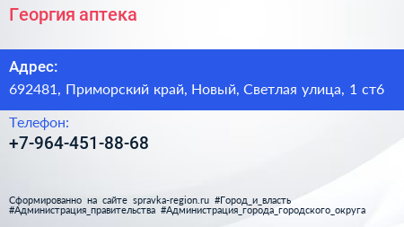 Георгия, аптека по адресу 692481, Приморский край, Новый, Светлая улица, 1 ст6 в дальнейшем Организация, размещена в следующих категориях: