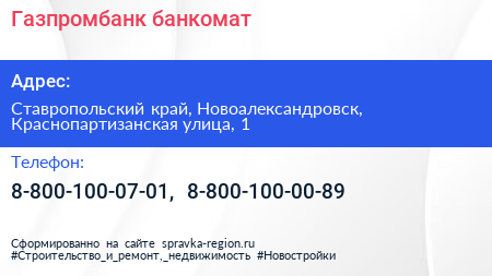 Газпромбанк, банкомат по адресу Ставропольский край, Новоалександровск, Краснопартизанская улица, 1 в дальнейшем Организация, размещена в следующих категориях: