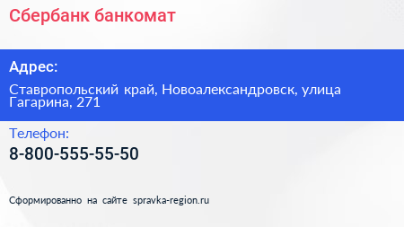 Сбербанк, банкомат по адресу Ставропольский край, Новоалександровск, улица Гагарина, 271 в дальнейшем Организация, размещена в следующих категориях:
