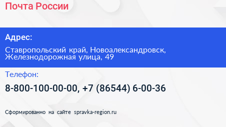 Почта России по адресу Ставропольский край, Новоалександровск, Железнодорожная улица, 49 в дальнейшем Организация, размещена в следующих категориях:
