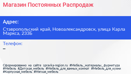 Магазин Постоянных Распродаж по адресу Ставропольский край, Новоалександровск, улица Карла Маркса, 233Б в дальнейшем Организация, размещена в следующих категориях:
