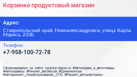 Корзинка, продуктовый магазин по адресу Ставропольский край, Новоалександровск, улица Карла Маркса, 233Б в дальнейшем Организация, размещена в следующих категориях: