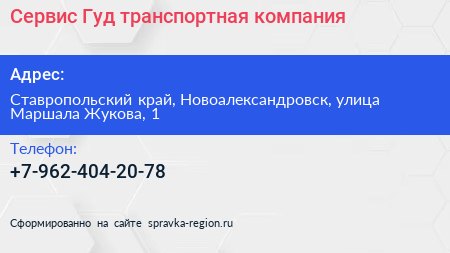 Сервис-Гуд, транспортная компания по адресу Ставропольский край, Новоалександровск, улица Маршала Жукова, 1 в дальнейшем Организация, размещена в следующих категориях: