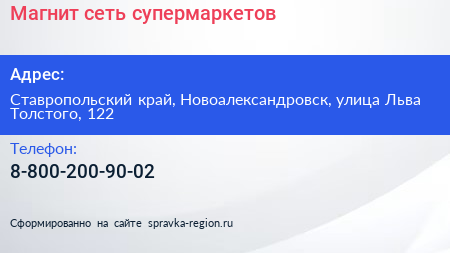 Магнит, сеть супермаркетов по адресу Ставропольский край, Новоалександровск, улица Льва Толстого, 122 в дальнейшем Организация, размещена в следующих категориях:
