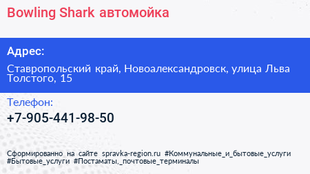 Bowling Shark, автомойка по адресу Ставропольский край, Новоалександровск, улица Льва Толстого, 15 в дальнейшем Организация, размещена в следующих категориях: