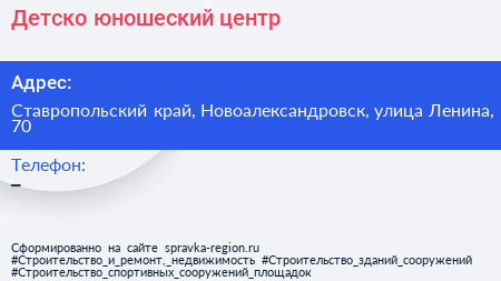Детско-юношеский центр по адресу Ставропольский край, Новоалександровск, улица Ленина, 70 в дальнейшем Организация, размещена в следующих категориях: