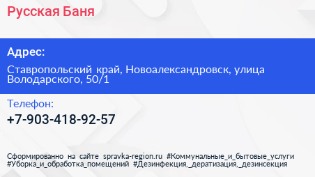Русская Баня по адресу Ставропольский край, Новоалександровск, улица Володарского, 50/1 в дальнейшем Организация, размещена в следующих категориях: