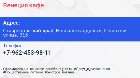 Венеция, кафе по адресу Ставропольский край, Новоалександровск, Советская улица, 315 в дальнейшем Организация, размещена в следующих категориях: