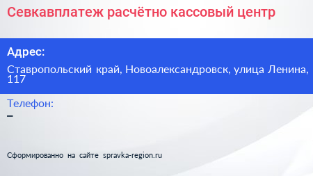 Севкавплатеж, расчётно-кассовый центр по адресу Ставропольский край, Новоалександровск, улица Ленина, 117 в дальнейшем Организация, размещена в следующих категориях: