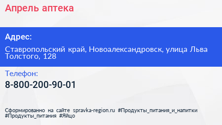 Апрель, аптека по адресу Ставропольский край, Новоалександровск, улица Льва Толстого, 128 в дальнейшем Организация, размещена в следующих категориях: