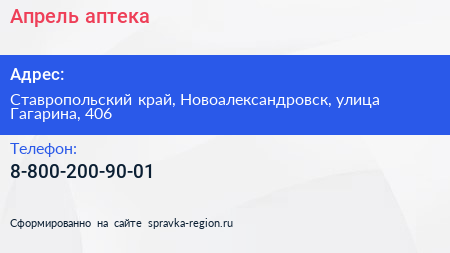 Апрель, аптека по адресу Ставропольский край, Новоалександровск, улица Гагарина, 406 в дальнейшем Организация, размещена в следующих категориях: