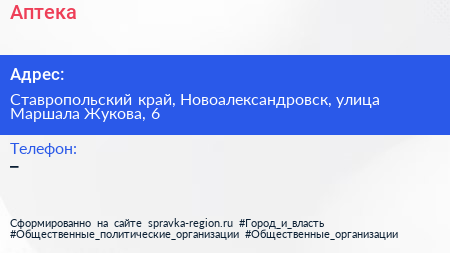 Аптека по адресу Ставропольский край, Новоалександровск, улица Маршала Жукова, 6 в дальнейшем Организация, размещена в следующих категориях: