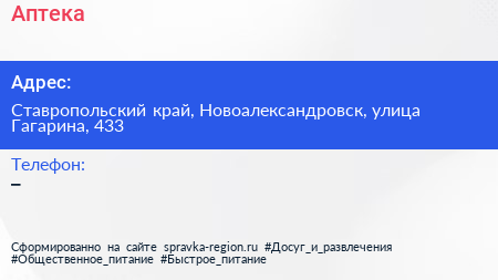 Аптека по адресу Ставропольский край, Новоалександровск, улица Гагарина, 433 в дальнейшем Организация, размещена в следующих категориях: