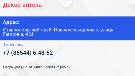 Декор, аптека по адресу Ставропольский край, Новоалександровск, улица Гагарина, 431 в дальнейшем Организация, размещена в следующих категориях: