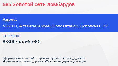 585*Золотой, сеть ломбардов по адресу 658080, Алтайский край, Новоалтайск, Деповская, 22 в дальнейшем Организация, размещена в следующих категориях: