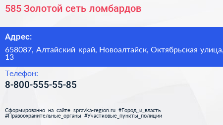 585*Золотой, сеть ломбардов по адресу 658087, Алтайский край, Новоалтайск, Октябрьская улица, 13 в дальнейшем Организация, размещена в следующих категориях: