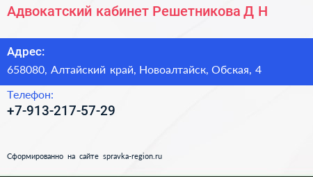 Адвокатский кабинет Решетникова Д.Н. по адресу 658080, Алтайский край, Новоалтайск, Обская, 4 в дальнейшем Организация, размещена в следующих категориях: