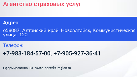 Агентство страховых услуг по адресу 658087, Алтайский край, Новоалтайск, Коммунистическая улица, 120 в дальнейшем Организация, размещена в следующих категориях: